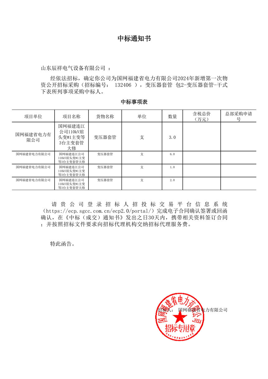 2024.12.18 變壓器套管中標(biāo)通知書
